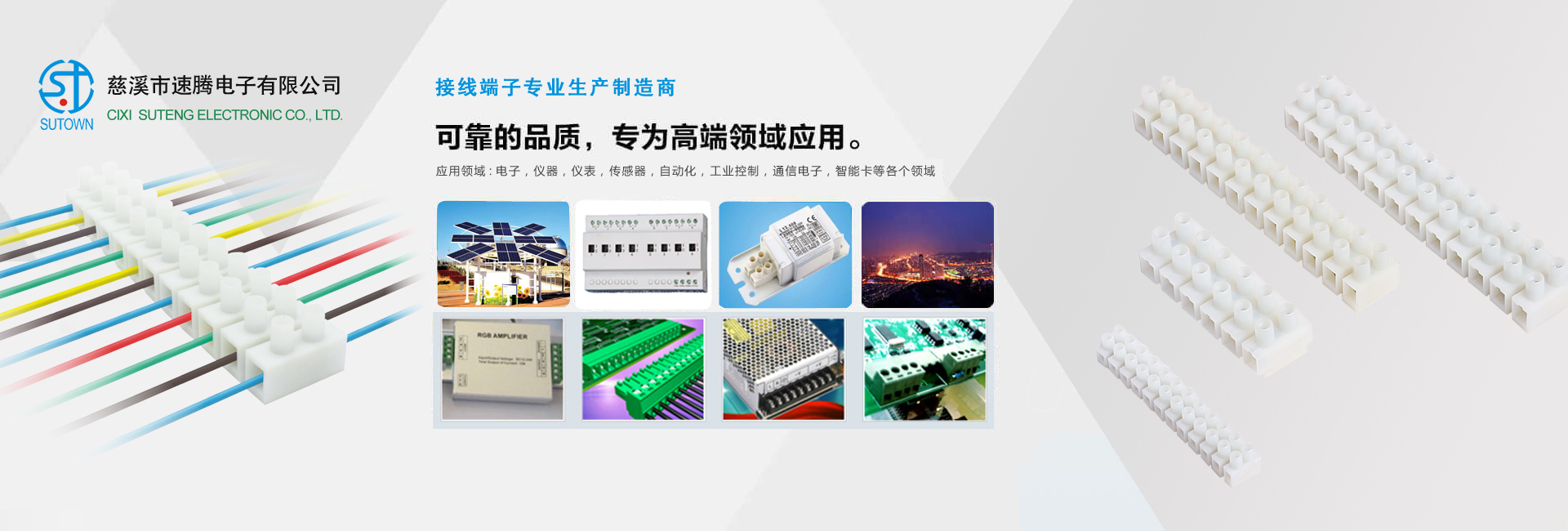 慈溪市速騰電子有限公司,是專業(yè)生接線端子生產(chǎn)廠家, 主要產(chǎn)品包話:貫通式接線端子;LED燈具端子;貼片端子;快速接線端子;插拔式接線端子;柵欄式接線端子;PCB接線端子;免螺絲式接線端子;LED電源接線端子;電氣接線端子;各類接線端子臺;歐式插座;撥碼開關;等各類連接器。 “速騰電子”堅持以人為本,以科技求發(fā)展、以質量求市場。我們的愿景目標是:做國內(nèi)領先,全球知名的電子連接元器件供應商。公司擁有完整、科學的質量管理體系。誠信、實力和產(chǎn)品質量獲得業(yè)界的認可。愿與廣大國內(nèi)外客戶同舟共濟,攜手共創(chuàng)輝煌的明天。 歡迎各界朋友蒞臨慈溪市速騰電子有限公司參觀、指導和業(yè)務洽談。 |